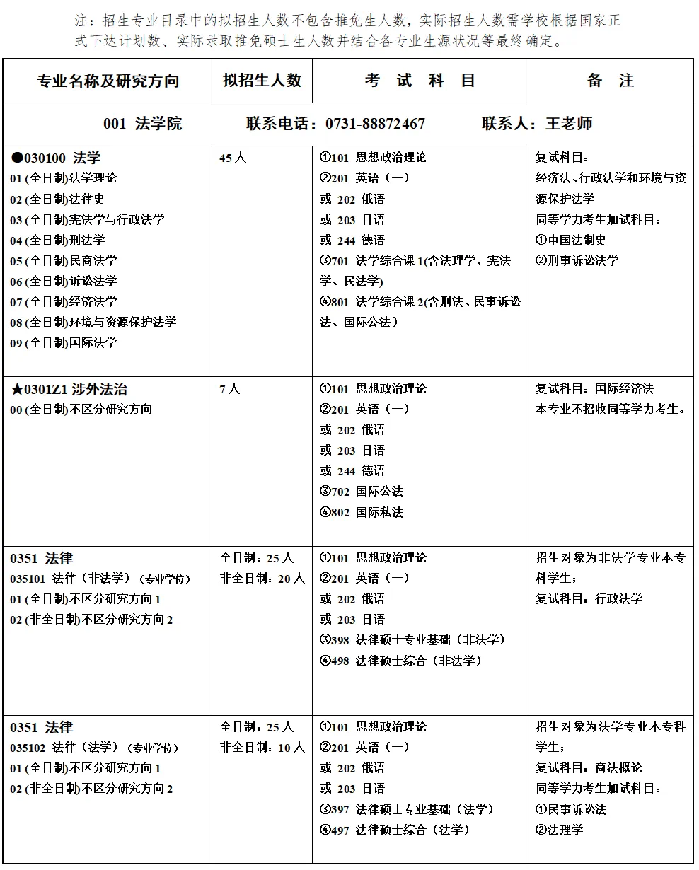 湖南师范大学法学院2025年法学学术学位硕士研究生计划招生52人,其中法学45人,涉外法治7人;专业学位硕士研究生计划招生80人,其中法律(非法学)全日制25人,非全日制20人,法律(法学)硕士全日制25人,非全日制10人。以上计划不包含推免生。